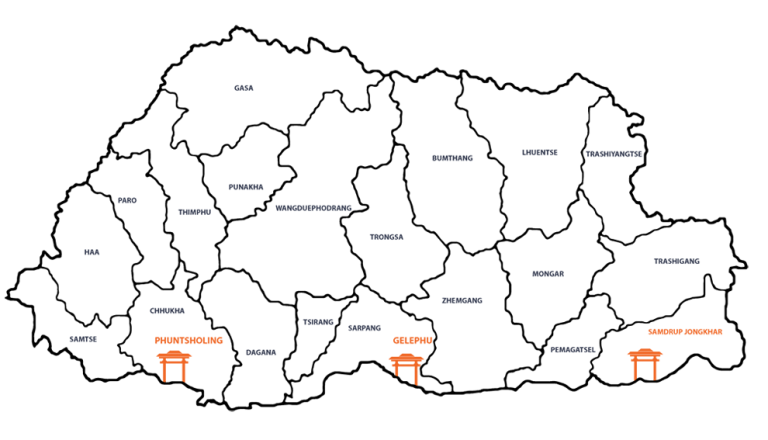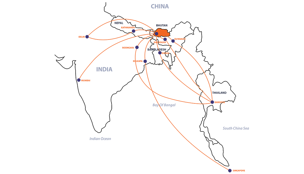 Currently only two airlines operate out of Bhutan – Druk Air and Bhutan Airlines, with departure points in Bangkok, Kathmandu, New Delhi, Kolkata, Mumbai, Dhaka, Yangon and Singapore. It is also possible to travel to Bhutan by road from India, The main border crossing is at Jaigaon-Phuentsholing and two others are at Gelephu and Samdrup Jongkhar.